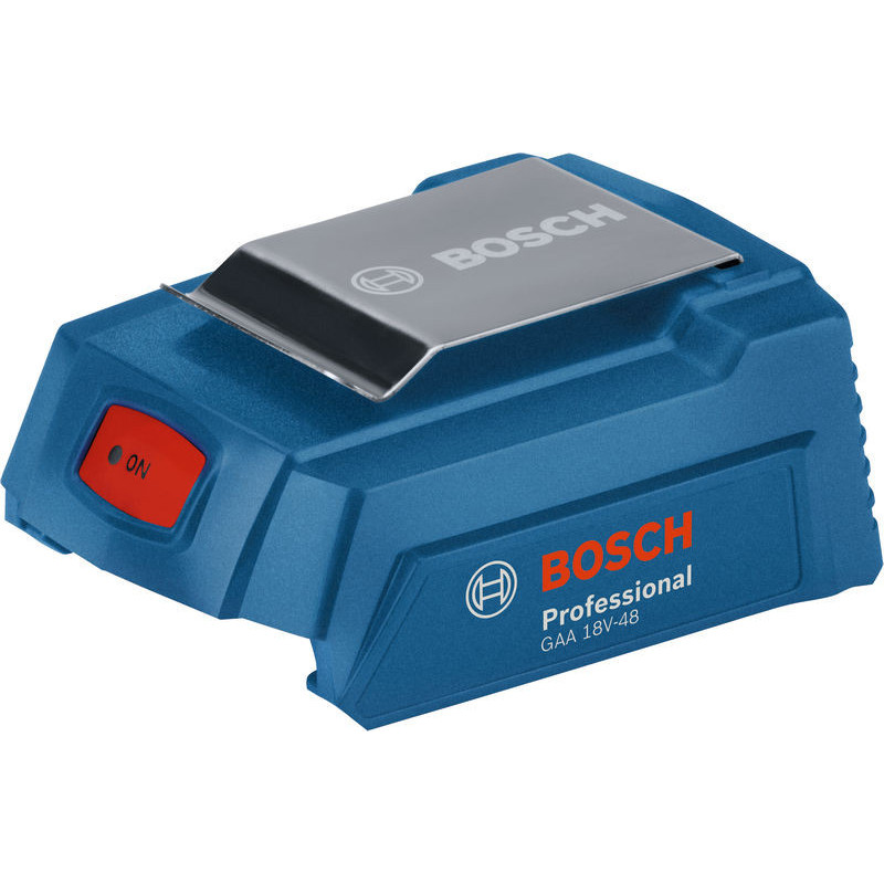 Адаптер Bosch GAA 18V-48 (06188000L6) – позволяет заряжать мобильные телефоны, планшеты и другие USB-устройства от профессиональной серии аккумуляторов Bosch Li-Ion напряжением 18 В, превращая их в Power Bank. Имеет два выхода USB и выход 12В.