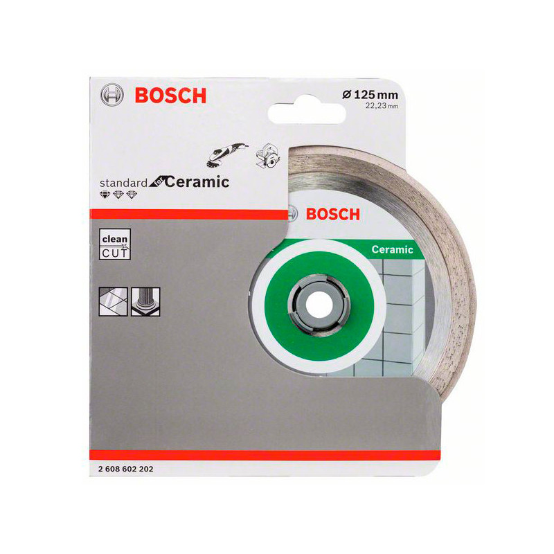 Отрезной алмазный диск Bosch Standard for Ceramic 125 мм. Предназначены для отделки таких материалов как: Керамическая плитка. Посадочное отверстие 22,23 мм, толщина сегмента 1,6 мм, высота 7 мм.