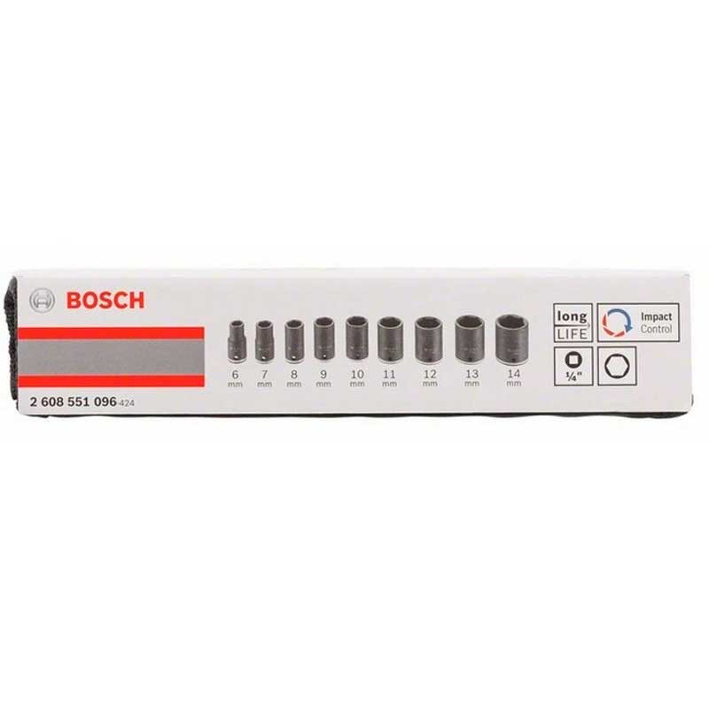Набор из 9 шт шестигранных головок Bosch Impact Control, с внутренним квадратом 1/4 дюйма. В наборе входит 9 торцевых ключей длиной 25 мм размерами ключа на 6, 7, 8, 9, 10, 11, 12, 13, 14 мм, и чехол для хранения и транспортировки. Изготовлены из особо прочного сплава для долгого срока службы.
