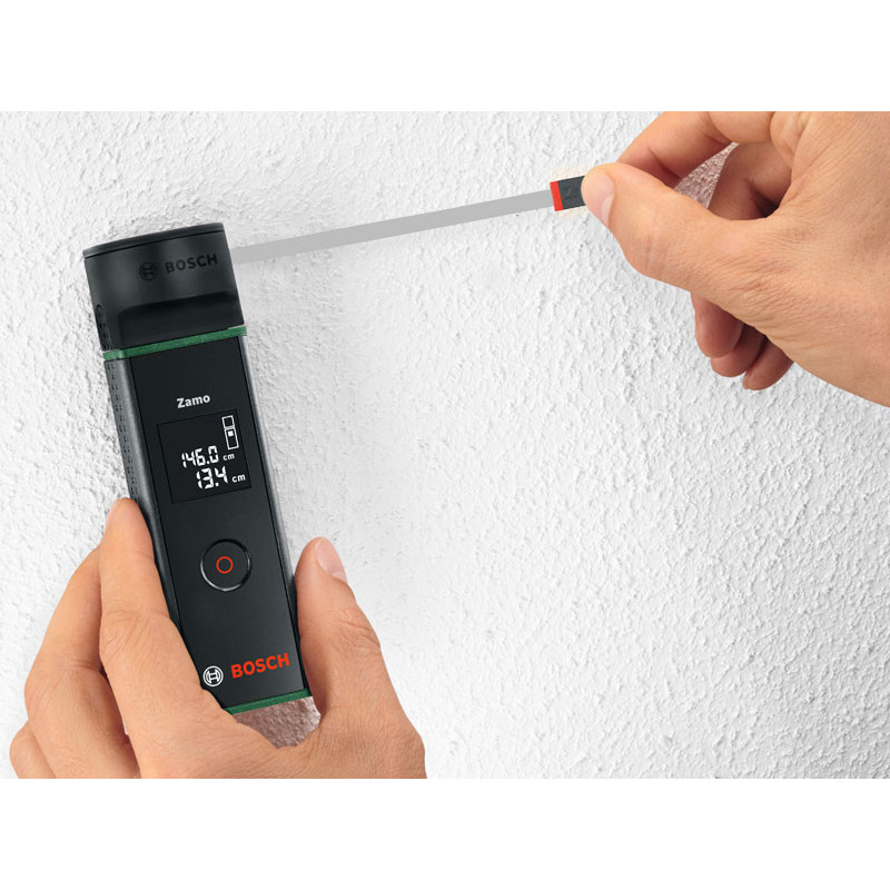 Самый компактный, 38x105x22 см, лазерный дальномер Bosch Zamo с дополнительным интерфейсом который позволяет подключать ленточный, колесный и линейный адаптеры. Диапазон измерений дальности до 20 м. Одно-кнопочное управление для простого управления.