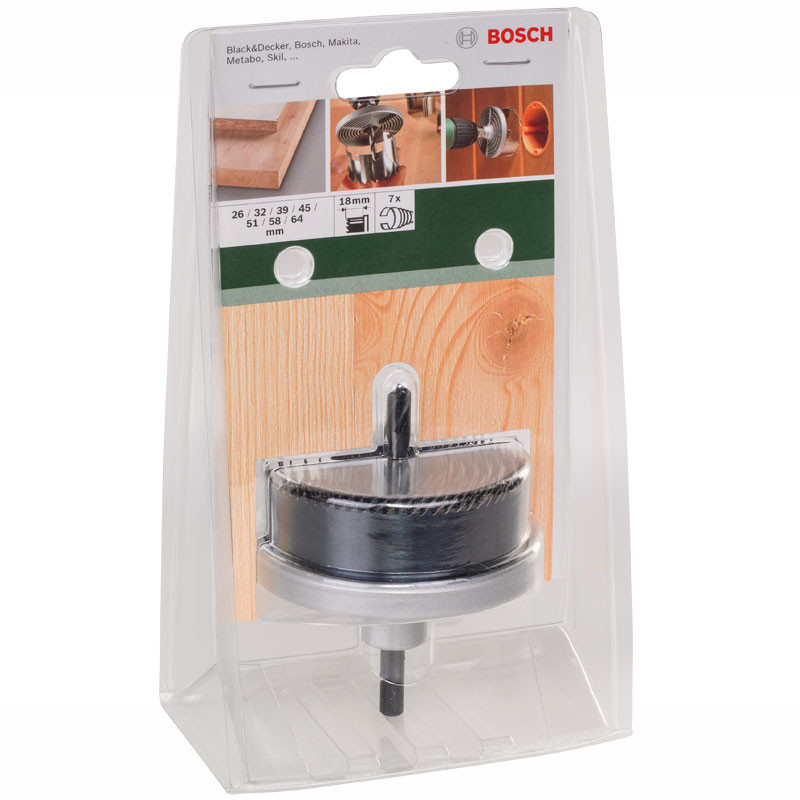 7 пиляльних винців для чистого свердління твердої та м'якої деревини, облицьованої шпоном деревини, ДСП із покриттям, поліетилену (труби, прути, профілі) (ПЕ), гіпсокартону. До набору входять найпоширеніші діаметри Ø 26/32/39/45/51/58/64 мм, завдовжки 18 мм. Загартовані зубці забезпечують тривалий термін роботи.