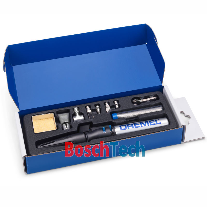 | Комплектация | Dremel VersaTip; Губка + коробочка; Пластиковая форма для хранения; Насадка для горячего воздуха; Нож для горячей резки; Отражатель; Паяльная насадка; Паяльная насадка с голубым острием; Плоская широкая нагревательная насадка; Режущий нож |