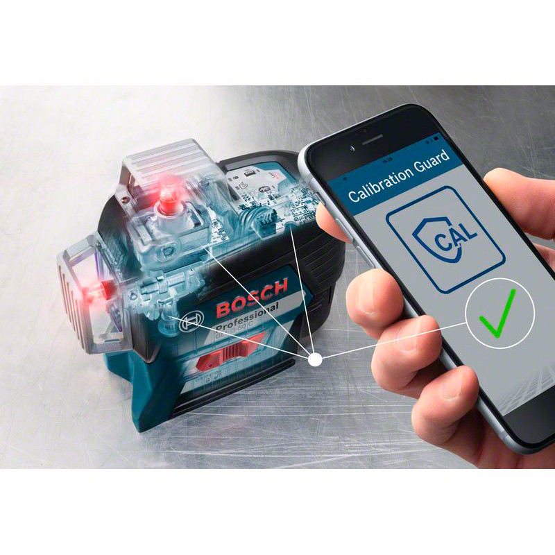 Преміум нівелір, з червоним променем, 3 лінії на 360 ° дозволяють одночасно виконувати нівелювання по горизонталі і в двох площинах по вертикалі, забезпечуючи високу точність роботи. Працює як від літій-іонної батареї 12 В, так і від стандартних лужних батарей АА (4 шт). Система для точного моніторингу та дистанційного керування по технології Bluetooth® за допомогою смартфона і додатки CAL Guard.