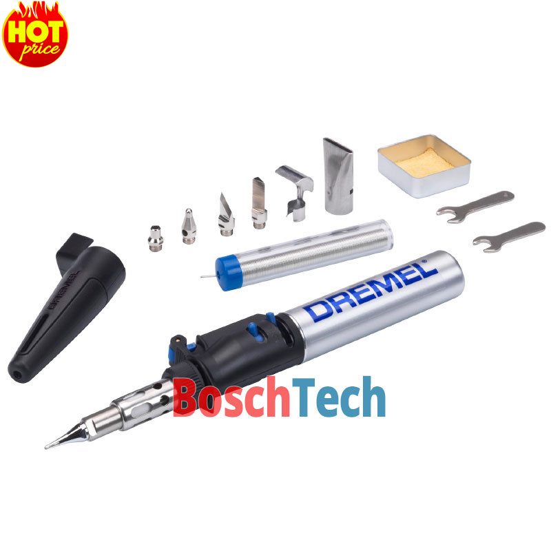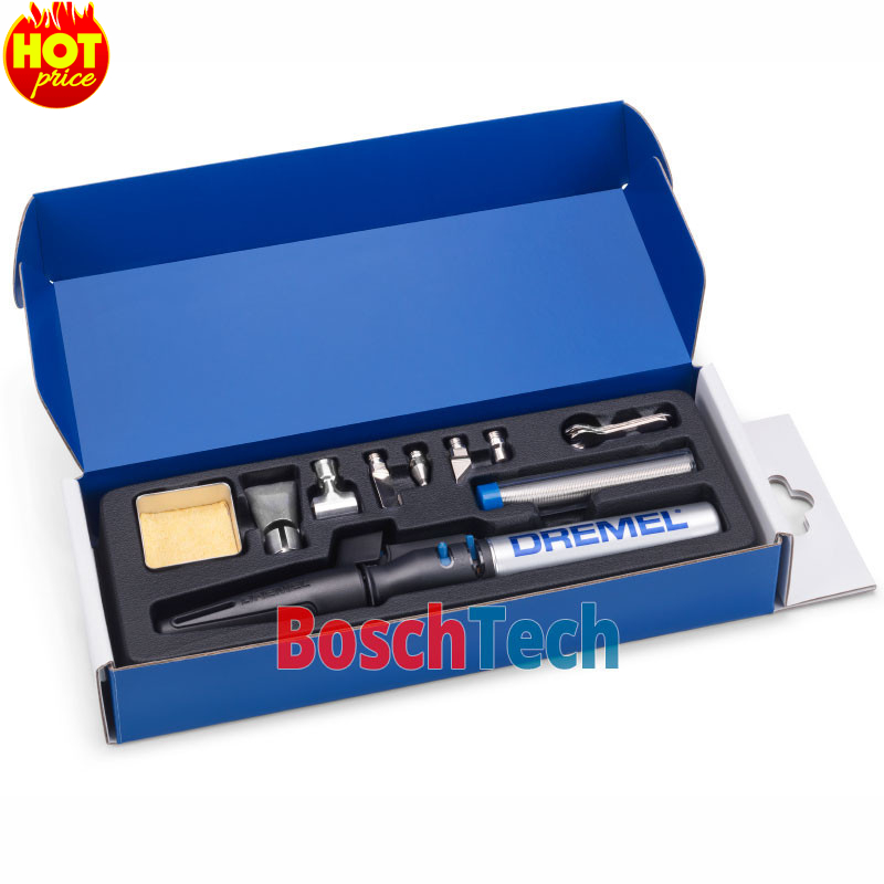 | Комплектація | Dremel VersaTip; Губка + коробочка; Пластикова форма для зберігання; Насадка для гарячого повітря; Ніж для гарячого різання; Відбивач; Паяльна насадка; Паяльна насадка з блакитним вістрям; Плоска широка нагрівальна насадка; Ріжучий ніж |