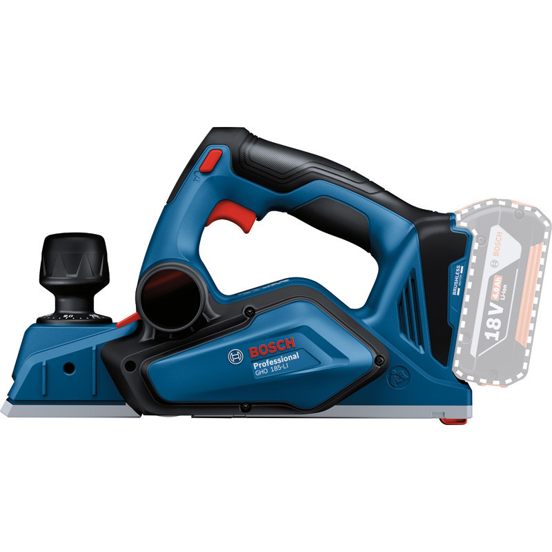 Акумуляторний рубанок Bosch GHO 185-L - ідеальний для мобільного використання, має гальмо двигуна, що зупиняє барабан менше ніж за секунду, головка з одним ножем для збільшеня часу роботи від акумулятора, 3 різні канавки для фаски. Додаткове відділення для зберігання полотна в інструменті. Функція constant electronic підтримує стабільну швидкість різання під навантаженням.