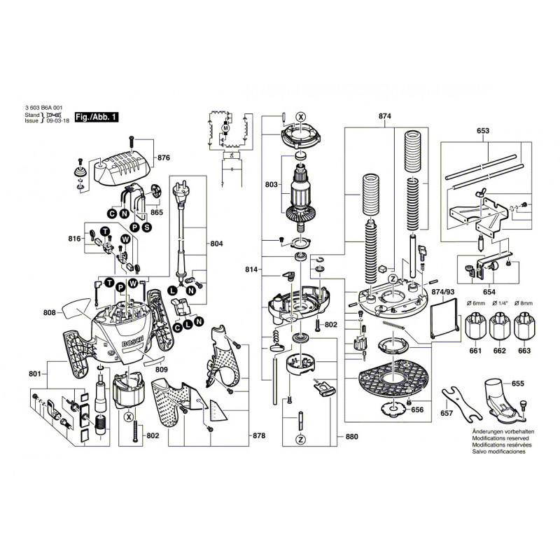 Комплектація | Цангові патрони 3 шт, (6 мм, 8 мм, 1/4 "); Пазова фреза (Ø 8 мм); Ріжковий ключ; Центрувальний стрижень; Копіювальна втулка; Паралельний упор; Всмоктуючий перехідник |